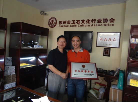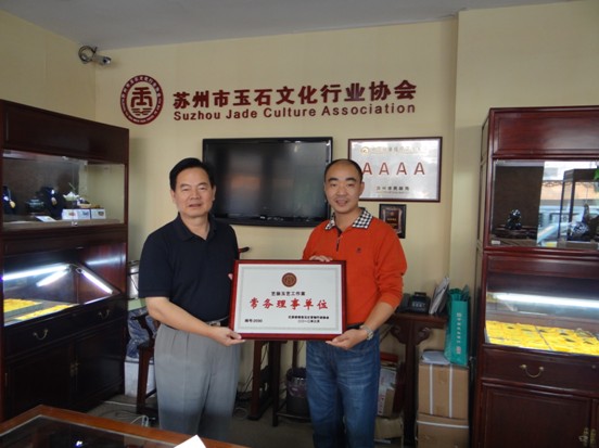 2012年10月24日下午,江苏省国土资源厅董献忠副厅长在百忙之中专程到苏州市玉石文化行业协会,为江苏省珠宝玉石首饰行业协会的副会长、常务理事、理事单位颁发牌匾。下图为董献忠副厅长为艺扬玉艺授“常务理事单位”牌匾。