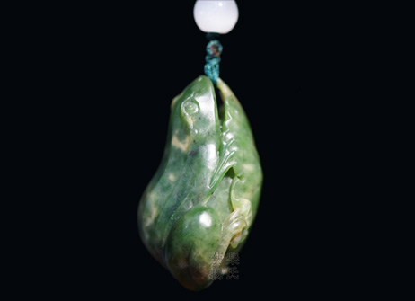 本作品采用优质碧玉精雕而成,材质油润,色彩清新明丽。一片碧绿的荷叶上,一只青蛙正在虎视眈眈,仿佛盯着眼前没有退路的猎物。整件作品顺色立意、依势造型,作品利用绝妙,工艺精湛细腻,生动传神,惟妙惟肖,属一件工、意、韵于一体的精品。 |