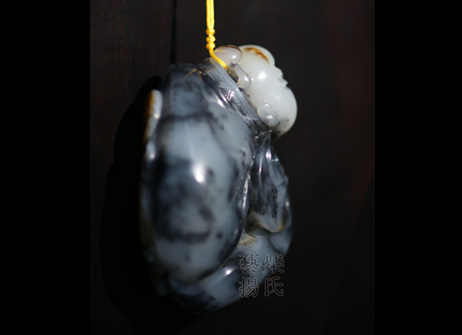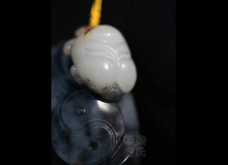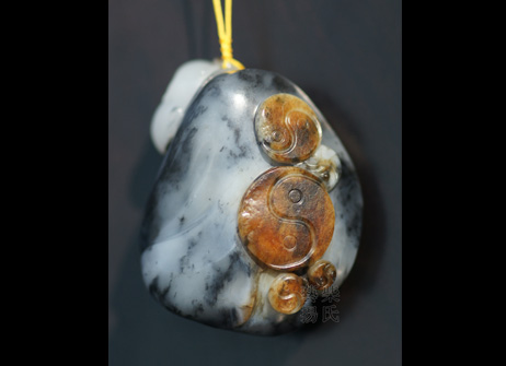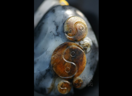 作品采用优质带皮青花籽料为创作材质,以中国传统文化元素太极作为创作题材。以写实手法,巧用白色俏雕为一张极具中国神韵的道教人士面孔,身形以原石顺形,以太极为衣饰,对比分明,线条简洁流畅,自然和谐,极具张力和视觉冲击。背部巧用皮色,大大小小雕刻出五个太极图,应合了道教人士列子太易、太始、太初、太素、太极,宇宙五阶段理念。此作品彰显了作者深厚的雕刻功底和对中国传统文化精髓深谙精通的文化修养,实为良工美工美玉,值得收藏。 |