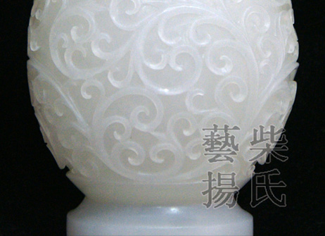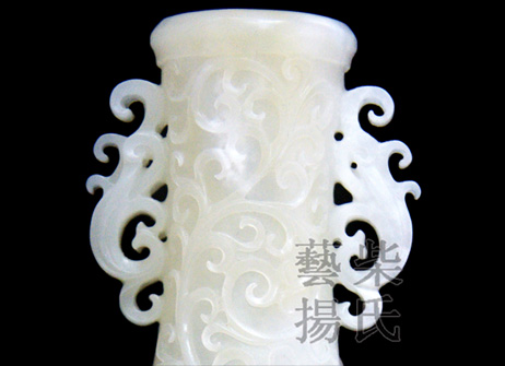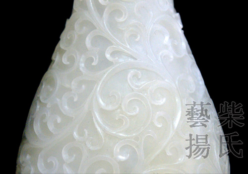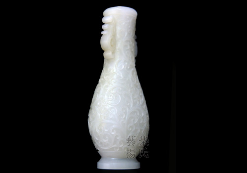 作品质地白润细腻,造型优美,线条宛转自然,如意纹双耳玲珑柔美,与瓶身造型和纹饰匹配、和谐;长颈内束,越显挺拔秀丽,质感的晶莹白润,造就了它的高贵品质;精湛的雕刻技艺,彰显了华美典雅的气质。是一件值得收藏的佳作! |