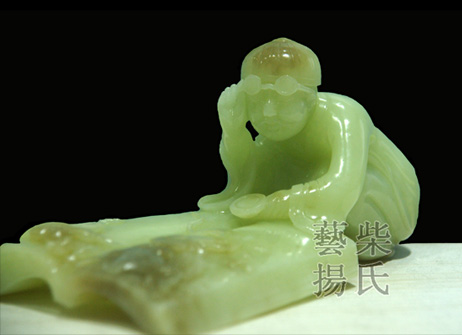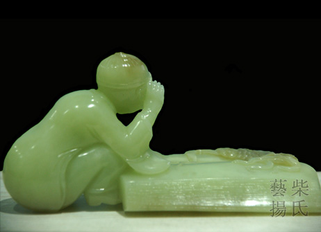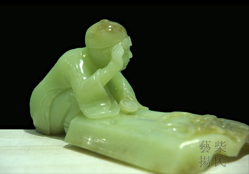 作者看到儿子看的漫画书《老夫子》灵感犹然而生,作品选取上等的黄玉精雕而成,玉质温润细腻,人物造型滑稽可爱,一手扶着眼镜,一手紧握放大镜,夸张的书本上利用糖色刻画出“书中自有黄金屋,书中自有颜如玉”的画面,正在冥想书籍带给人成功的力量。糖色悄然天成,雕工精细、熟练老道,彰显作者深厚的艺术功底和娴熟的雕琢技法。