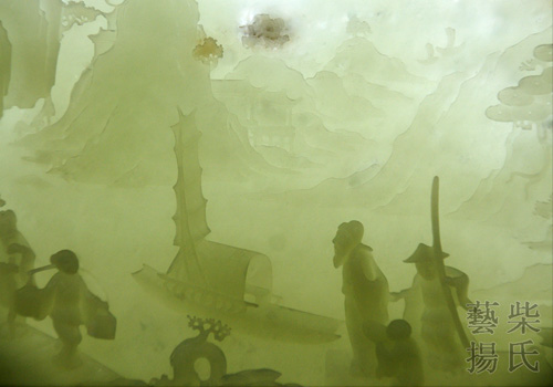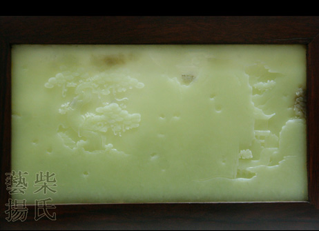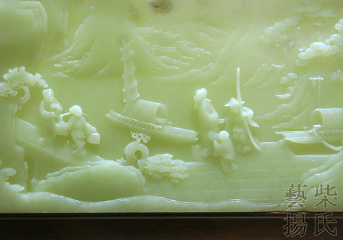 作品的料质、大小比例均属上乘,设计布局,疏密有度。此图为秋天景色,以浸浴在水光林野之中的华美庄院为主景,对面坡岸上有两名挑担的村夫,主仆一行在巨松下等待划驶而来的渡舟。人物、穿屋均雕刻精细。秋山寒林,形象洗练而完整,给人以身临其境之感。所作秋山、林木、村居、野渡具有雄伟苍凉的气氛,使观者如在“灞桥风雪中,三峡闻猿时”。