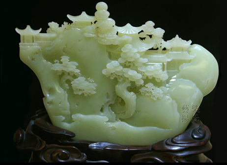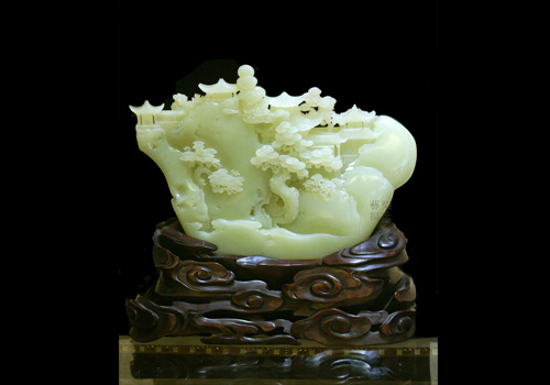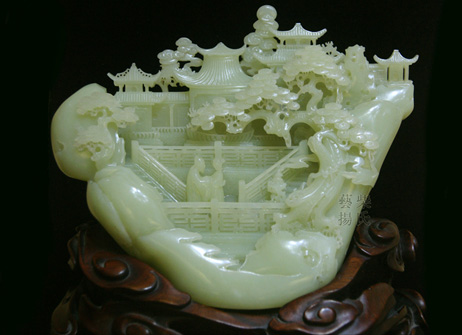 作品玉质细腻纯净,成色均匀,玉质凝聚,脉理坚密,精光内蕴,作者也大胆将南北山子相互结合,远处的楼台亭阁既有北方的破形之作,又有南派的细腻镂空。正面雕琢唐明皇与杨贵妃在长生殿前盟誓之景,人物刻画传神,颇具动感,布局合理,层次分明。