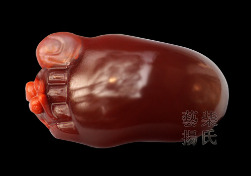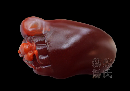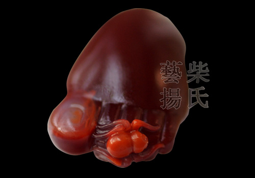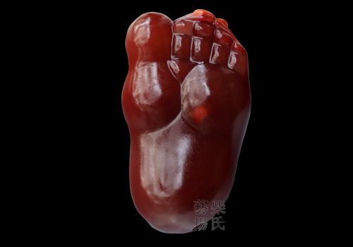 作品选取上好南红玛瑙雕刻而成,材质颜色俏丽、结构缜密,作品表现的是一只蜘蛛伏在脚(足)上。