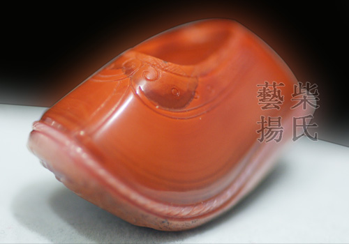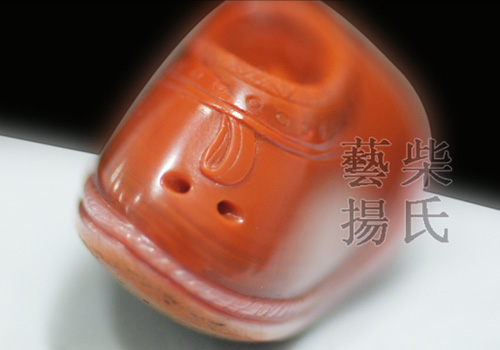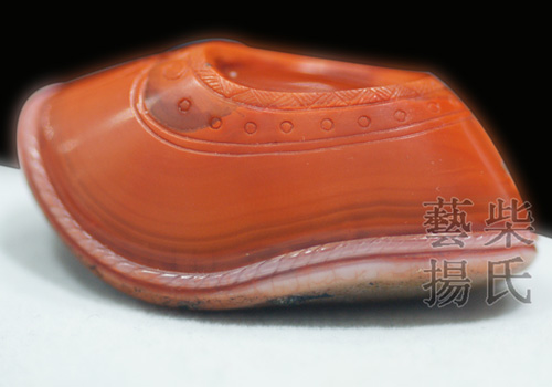 本作品色呈柿子红,极为漂亮,材质油润缜密,雕工精细,游刃有余。作者根据原石的原皮雕刻出鞋子的底纹,鞋底一团祥云,寓意平步青云。